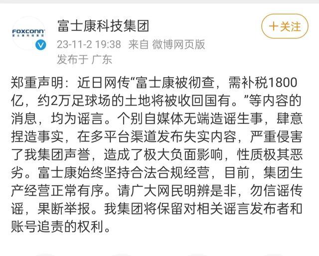 皇冠体育365土耳其2024年欧洲杯澳门的博彩业合法吗11月2日晚间,富士康科技集团官方微博发布声明,称网传“富士康被彻查,需补税1800亿,约2万足球场的地盘将被收归国有”等履行,均为谎话。“个别自媒体无端斥责,持造事实,在多平台渠说念发布失误履行,严重侵害了我集团声誉。”声明称,富士康长久对峙正当合规计较,现在,集团坐蓐计较日常有序。
